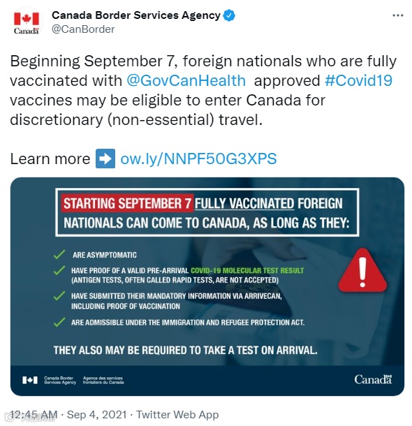 1、旅行者必须证明在抵达前至少14天接种了两剂加国批准的新冠疫苗(辉瑞、莫德纳、阿斯利康和强生),并且没有新冠症状;