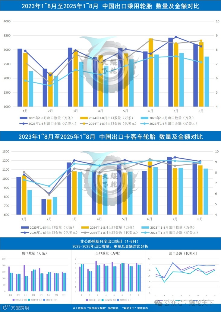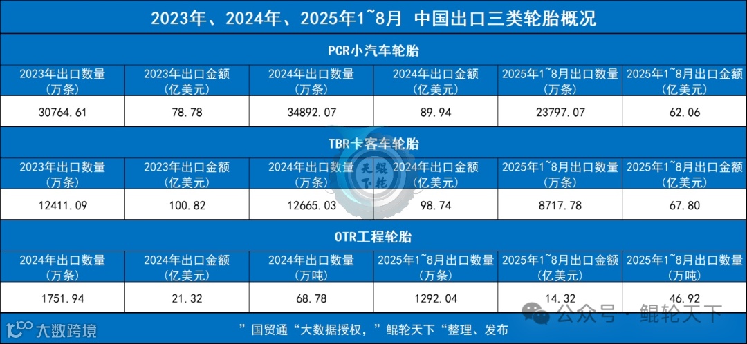 2025年1-8月OTR轮胎出口1292.04万条,计46.92万吨,金额14.32亿美元[1]。