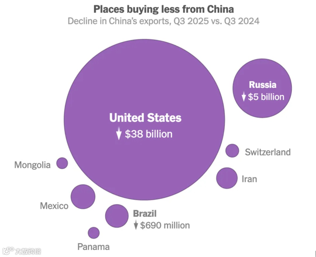 面对美国市场高达380亿美元的萎缩,中国出口成功实现了向全球其他地区的战略转移。2025年第三季度的同比数据表明,全球市场的增量不仅完全抵消了美国的下降,更彰显出中国出口引擎的强大动力与高度灵活性。