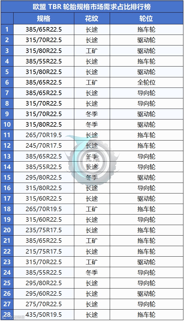 欧洲TBR轮胎市场是高度标准化的市场,385/65R22.5等大单胎规格代表了技术发展方向,增长潜力巨大。按照欧洲TBR轮胎规格市场需求占比排行榜统计,前十名的市场占有率达到50%以上。