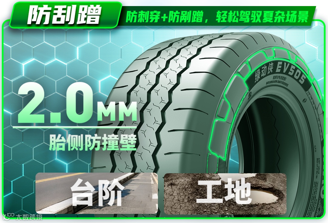 EV505的底气,源于其独特设计与顶尖智造的完美结合。独特的冠部抗刺穿与胎侧防剐蹭设计,让它在烂路、窄巷等复杂工况下游刃有余,用户可满载大胆前行。
