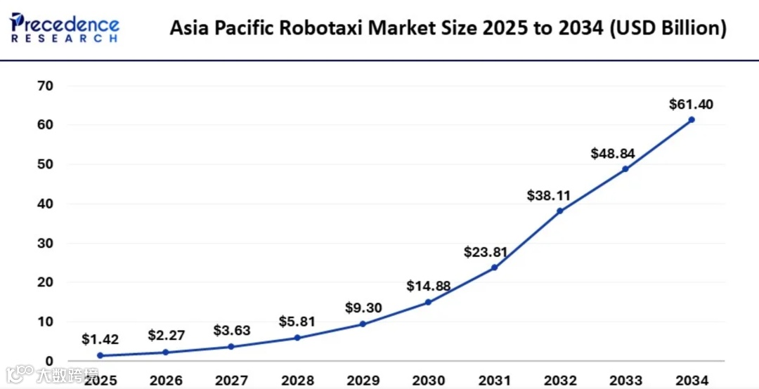 亚太地区无人出租车市场规模在2024年已突破8.9亿美元,预计到2034年将突破614亿美元,2025年至2034年期间的复合年增长率(CAGR)预计达52.71%。