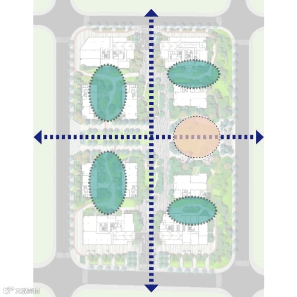 二轴分别为:蜿蜒曲折的绿化是景观轴;笔直的南北向交通体系是科技轴。景观轴,以高大乔木为主的休闲景观带,搭配景观小品、叠落花坛和低矮灌木,错落有致,亲切宜人。科技轴,具有引领科技时代的大气和速度,强调景观排列的节奏感和人文关怀。