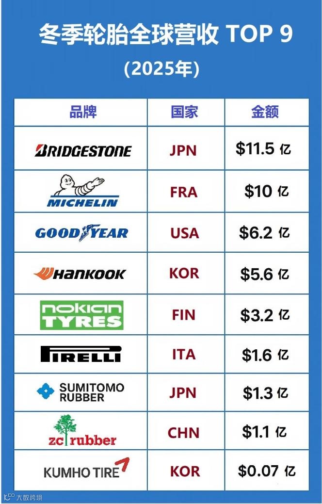 中国的中策橡胶贡献了1.1亿美元营收,反映了其不断扩大的影响力,也表明它们通过在研发、可持续发展和性能工程方面的投资,成功进入了冬季轮胎的国际市场,赢得了消费者的认可。