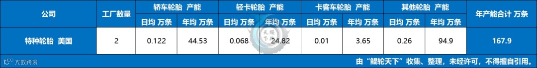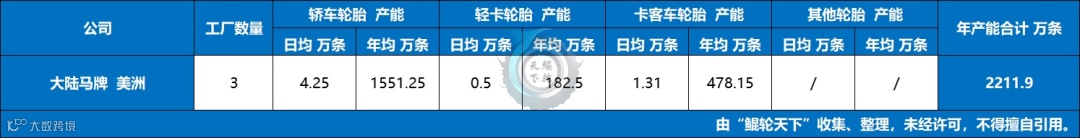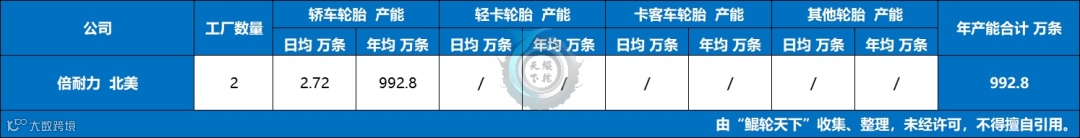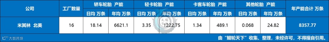 “鲲轮天下”收集、整理、汇总了2024年的北美地区的轮胎产能,共涉及各类子午、斜交轮胎产能:35576.915万条/年,(轿车胎25298.88万条/年、轻卡胎4850.12万条/年、卡客车胎24335.5万条/年、其他轮胎2993.365万条/年)。