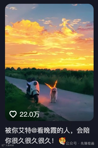 01.《夕阳狗狗》这类作品本月很多作者都做爆了。最高做到了22万点赞,同学们到抖音搜索:“被你艾特@看晚霞的人,会陪你很久很久很久!🥰” 标题就可以看到大量这样的作品。