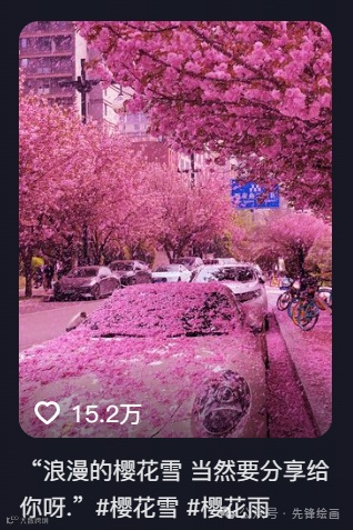 03.《樱花跑车》这类作品本月很多作者都做爆了。最高做到了15.2万点赞,同学们到抖音搜索:“浪漫的樱花雨 当然要分享给你呀!”标题就可以看到大量这样的作品。