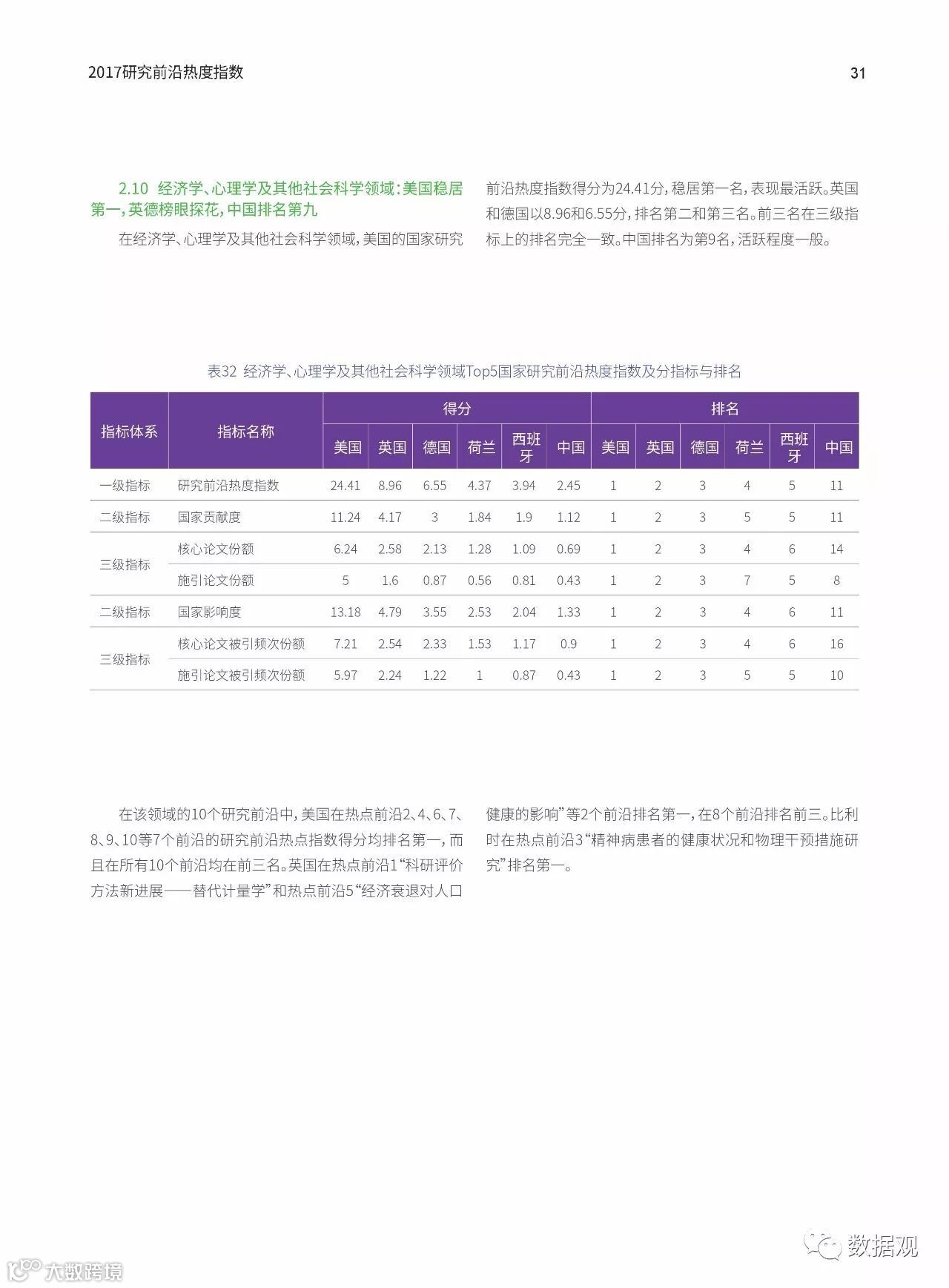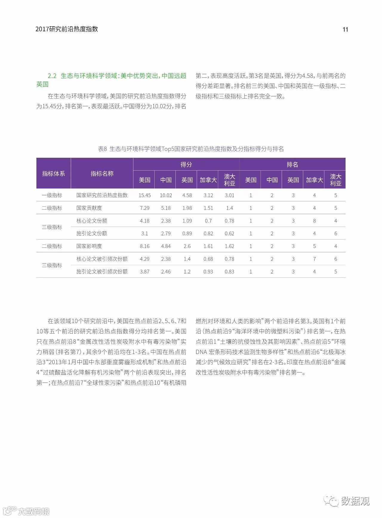 在《2017研究前沿》基础上,《2017研究前沿热度指数》评估了世界主要国家在上述前沿领域中的研究活跃程度。报告称,美国、中国、英国在这些前沿领域研究最为活跃。在10个领域中,美国在8个领域得分排名第一。中国在化学与材料科学领域和数学、计算机科学与工程学领域得分排名第一,显示出中国学者在这两个领域的研究前沿最为活跃。但中国在临床医学领域、天文学与天体物理领域和经济学、心理学及其他社会科学领域等3个领域得分较为靠后。