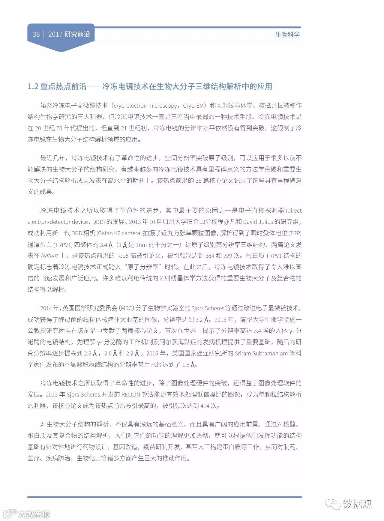 《2017研究前沿》突出显示了等10个高度聚合的大学科领域中的100个热点前沿和43个新兴前沿。在143个前沿中,“冷冻电镜技术在生物大分子三维结构解析中的应用”是今年诺贝尔化学奖的主题,“双黑洞等双致密天体的形成及并合”与今年诺贝尔物理学奖主题引力波研究密切相关。