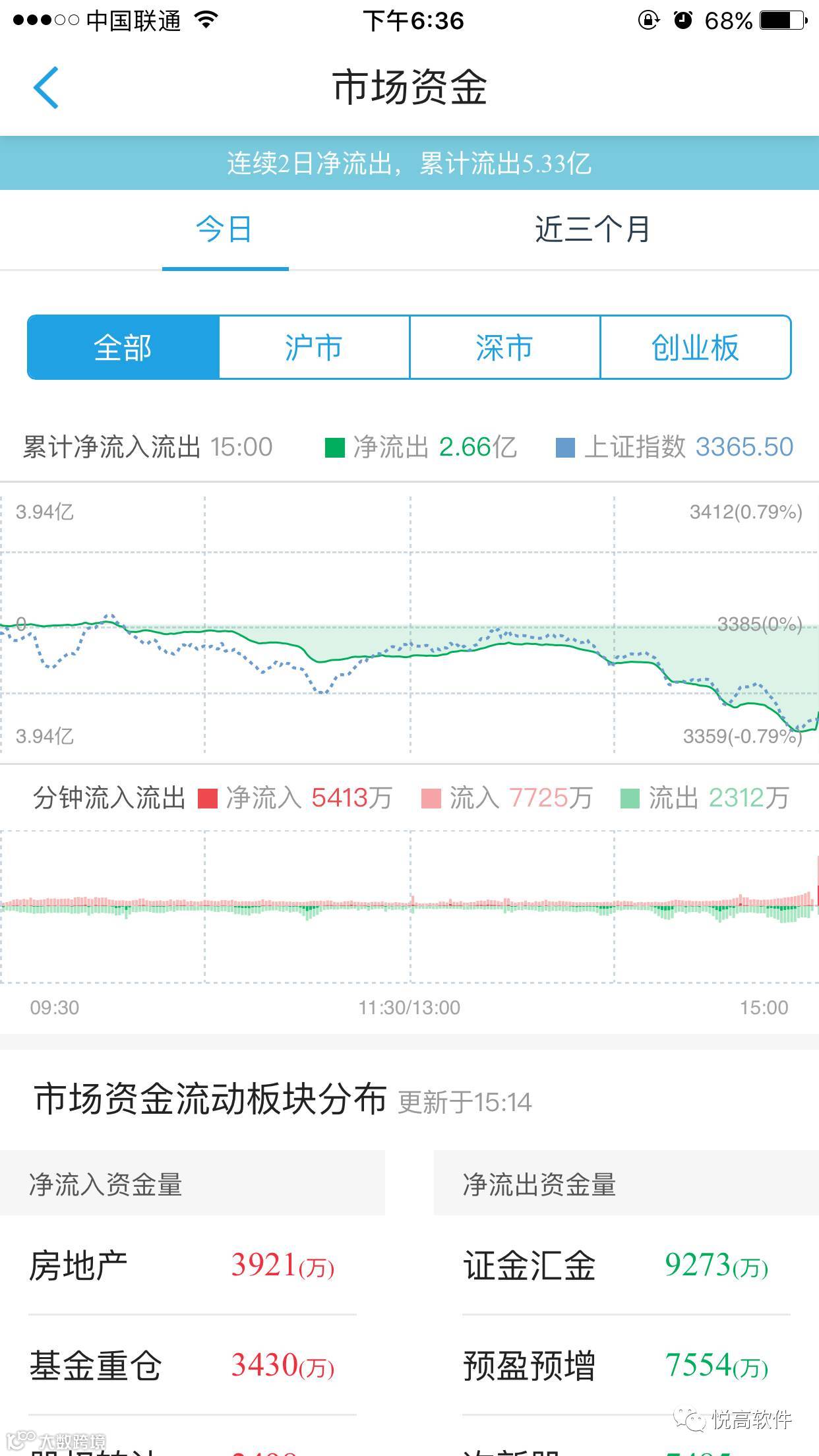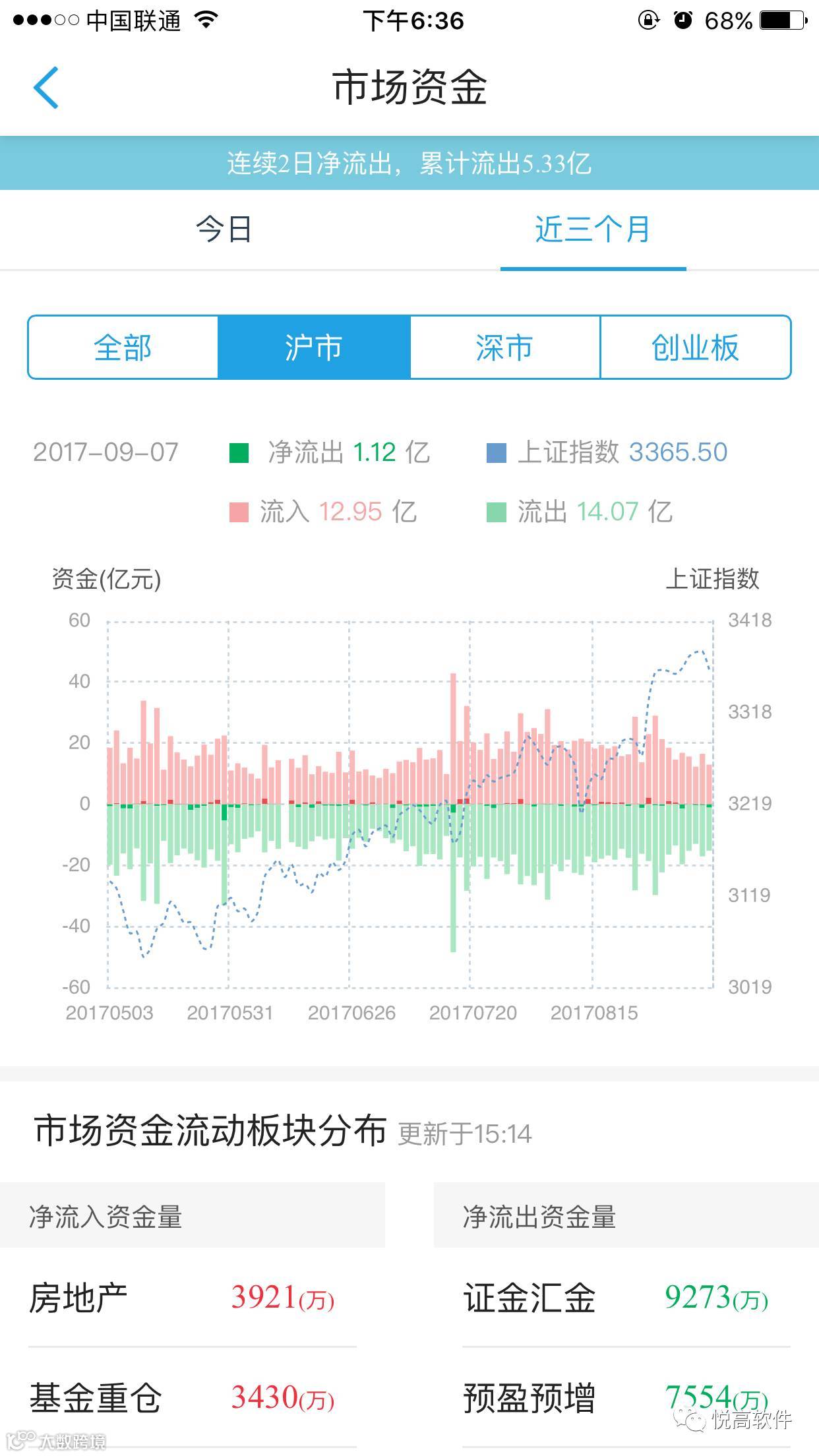 统计市场所有股票的资金流入流出情况,从而得到整个A股市场的资金流入流出情况,及时反映市场的情绪。