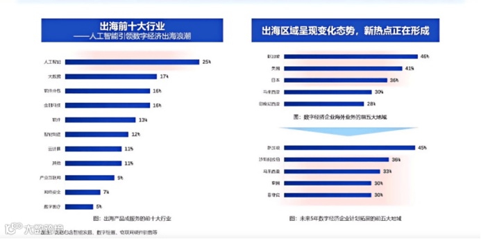 从出海的行业分布来看,现在比较热门的人工智能、大数据、软件外包和金融科技占比较多。人工智能行业排第一,引领了数字经济出海浪潮。