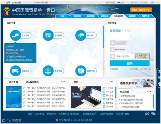 登录中国国际贸易“单一窗口”(网址:https://www.singlewindow.cn/),选择“标准版应用”下的“企业资质”—“关企合作平台”。请参照下图: