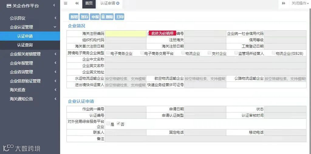 进入“企业认证管理”模块,选择“认证申请”,填写相应内容。