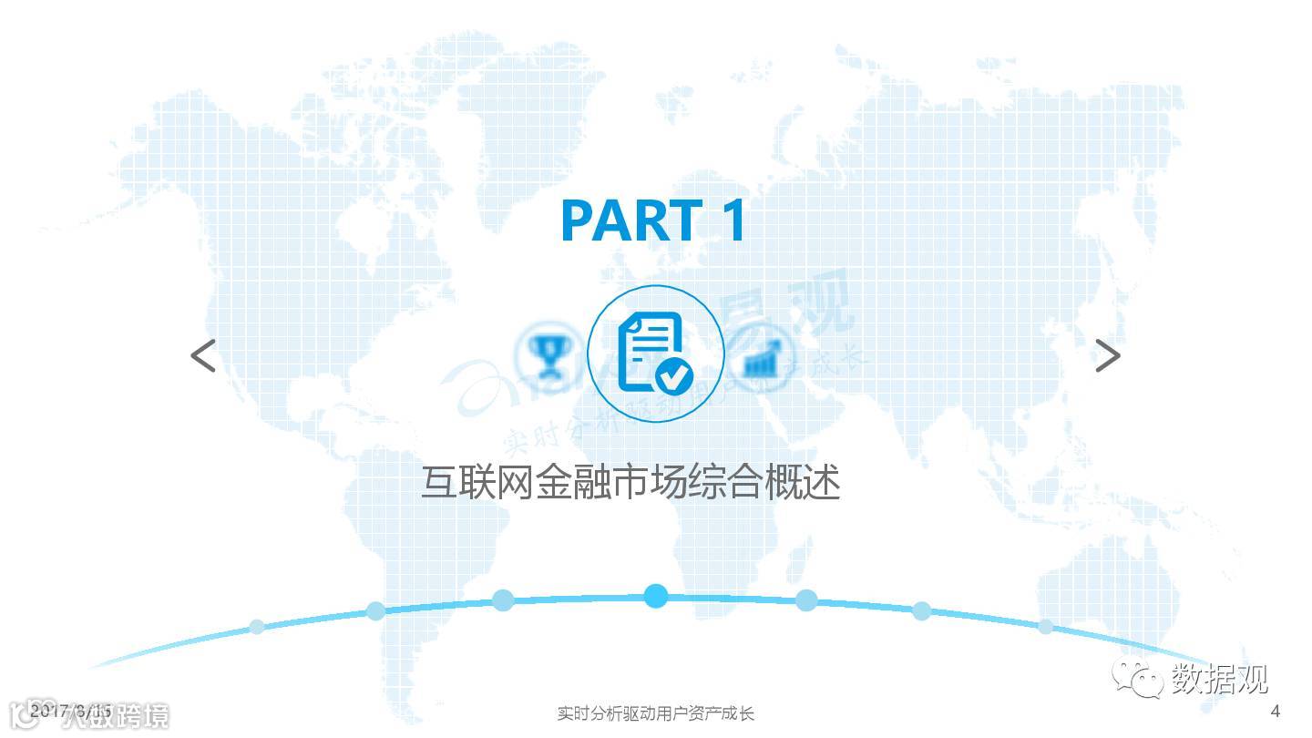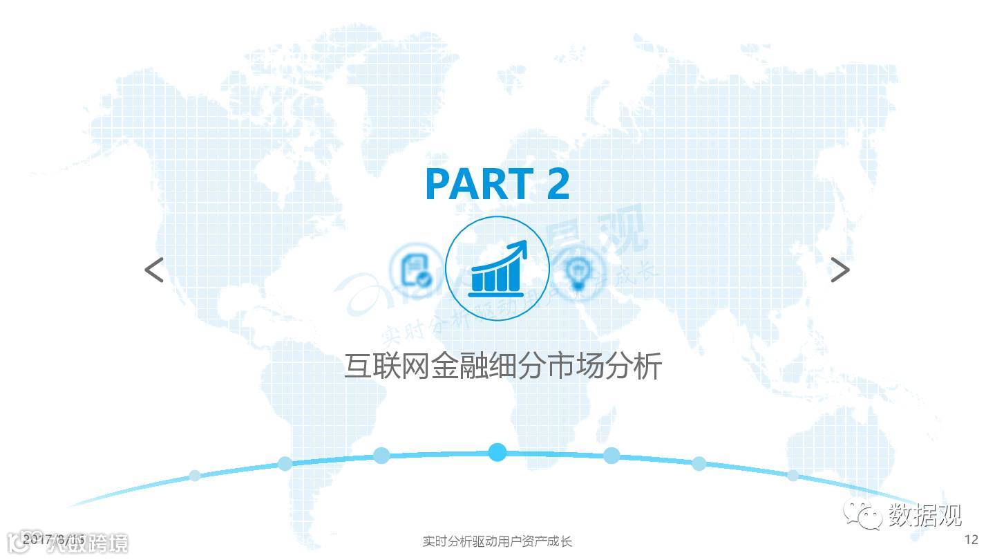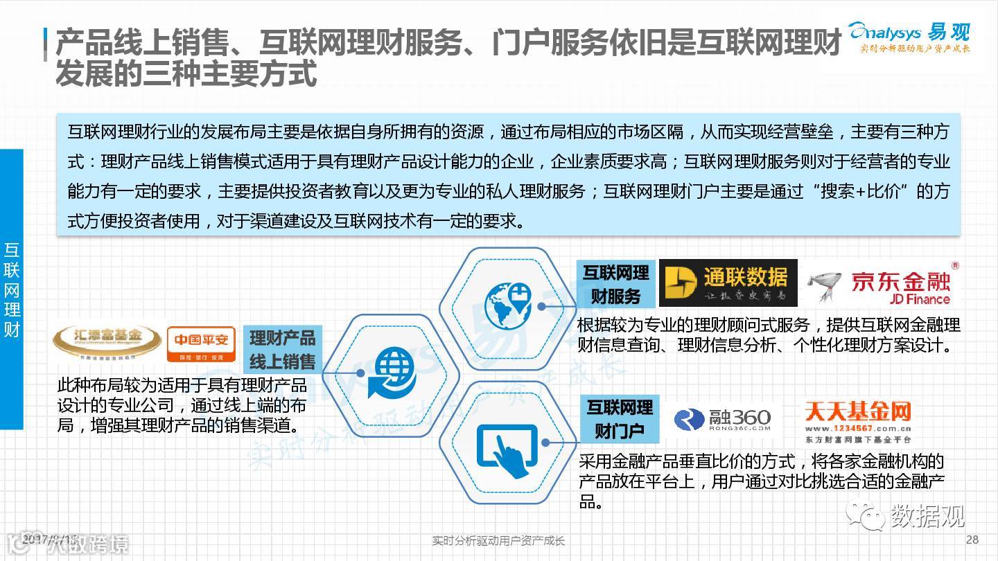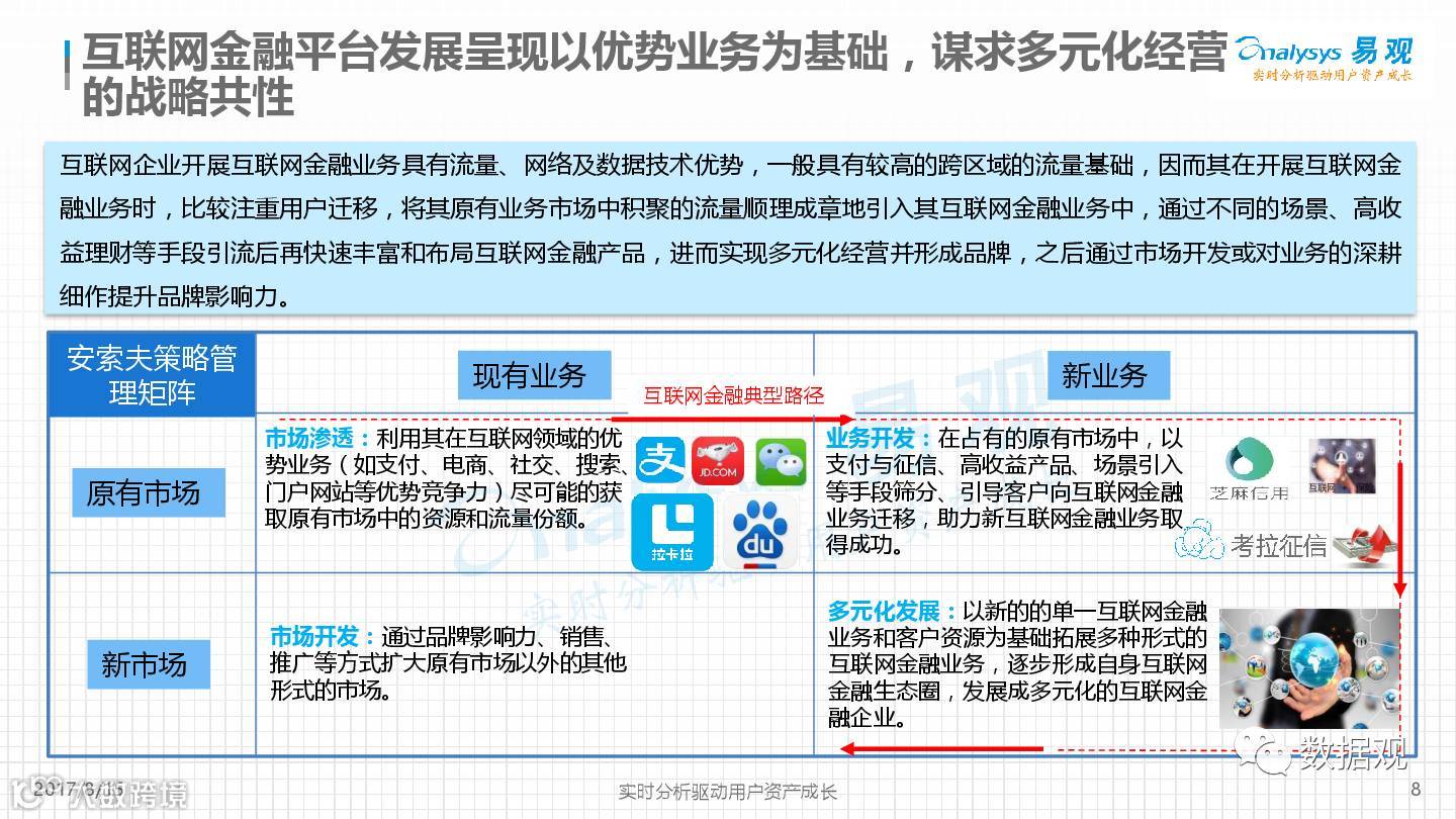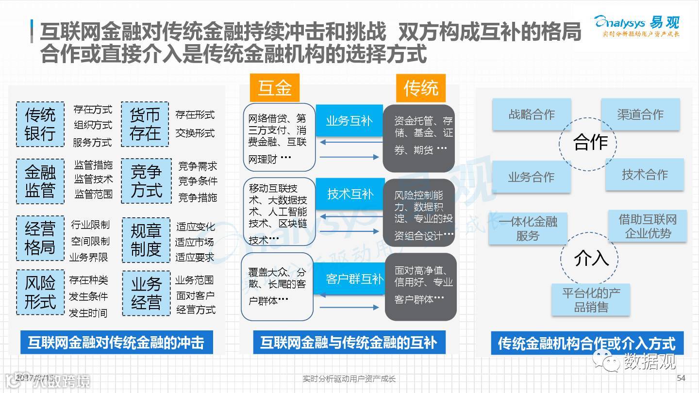 2017年8月,易观发布了《中国互联网金融行业专题分析2017》的专题研究报告。报告的分析内容主要针对《关于促进互联网金融健康发展的指导意见》对于互联网金融各类型的划分,包括第三方支付、网络借贷、互联网理财、互联网保险、股权众筹等。从互联网金融综合概述、细分市场、案例解读、未来趋势四个方面阐述了2016年互联网金融的发展现状及未来互联网金融的发展趋势。