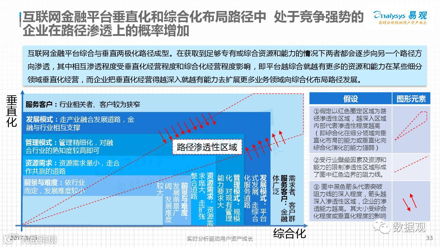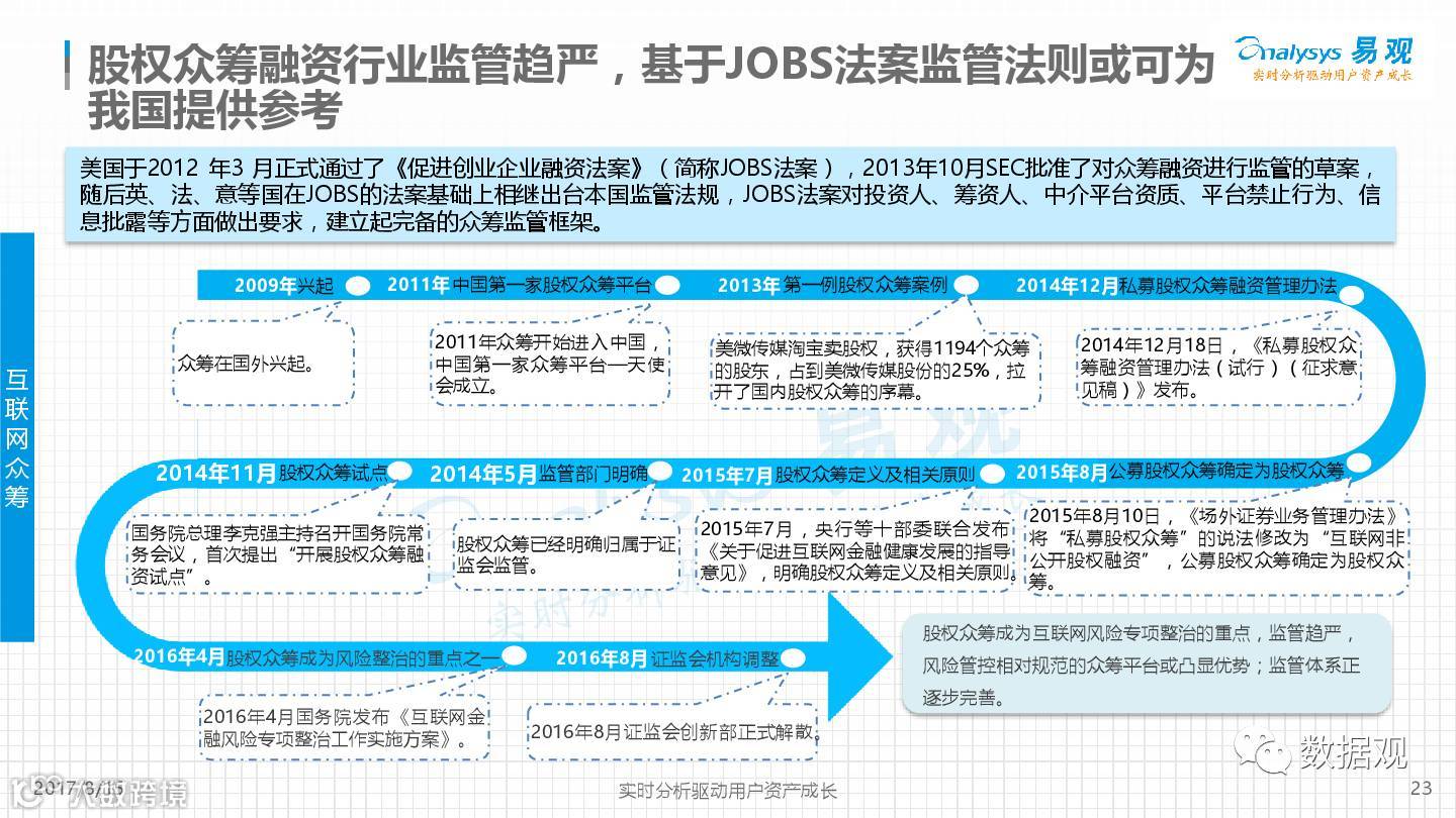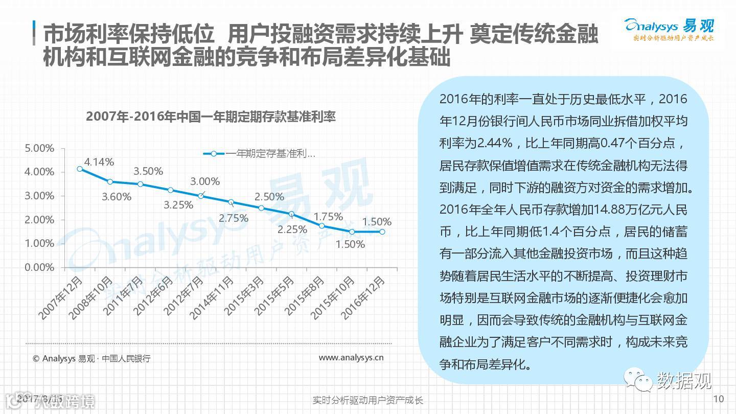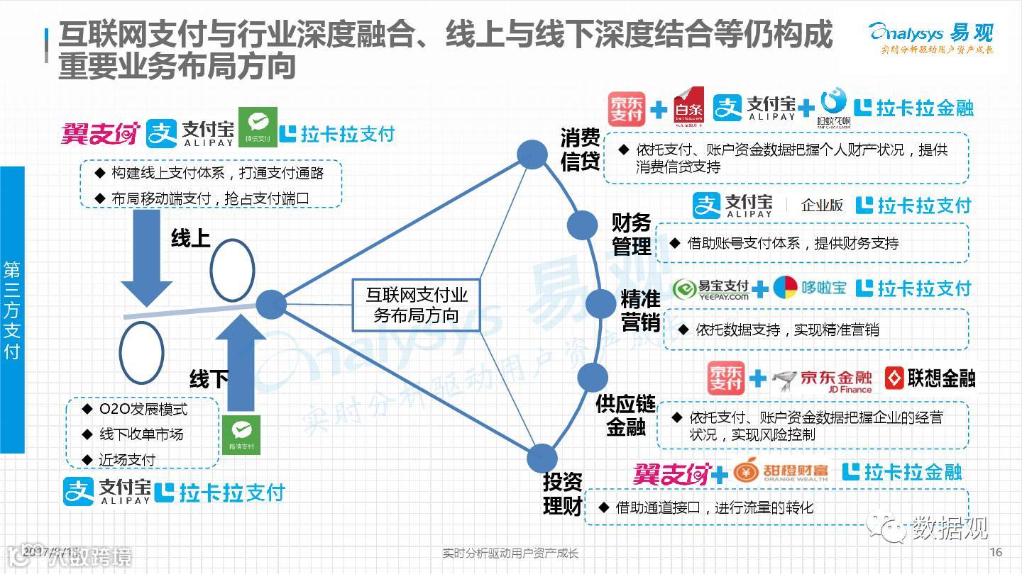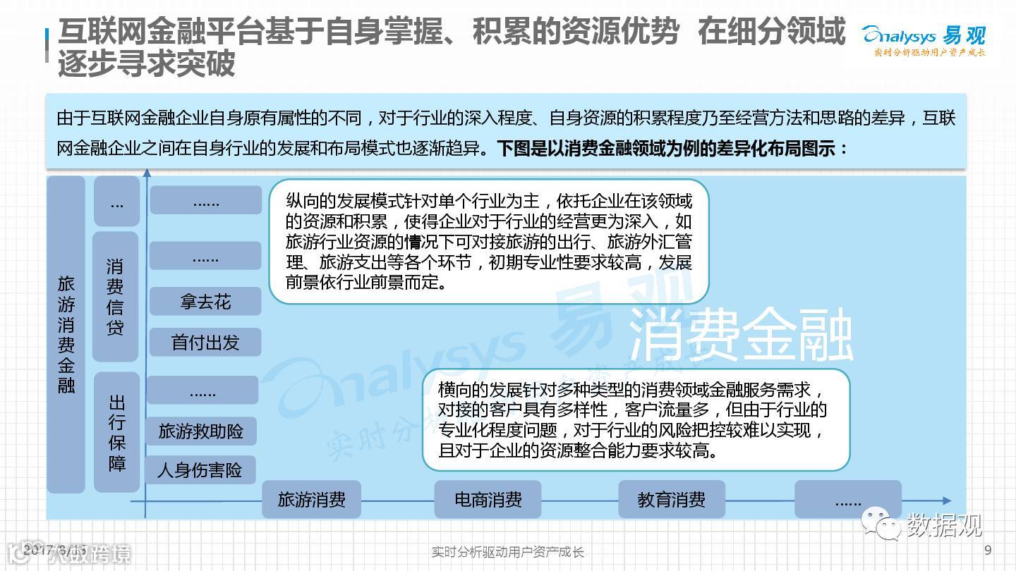 2017年8月,易观发布了《中国互联网金融行业专题分析2017》的专题研究报告。报告的分析内容主要针对《关于促进互联网金融健康发展的指导意见》对于互联网金融各类型的划分,包括第三方支付、网络借贷、互联网理财、互联网保险、股权众筹等。从互联网金融综合概述、细分市场、案例解读、未来趋势四个方面阐述了2016年互联网金融的发展现状及未来互联网金融的发展趋势。