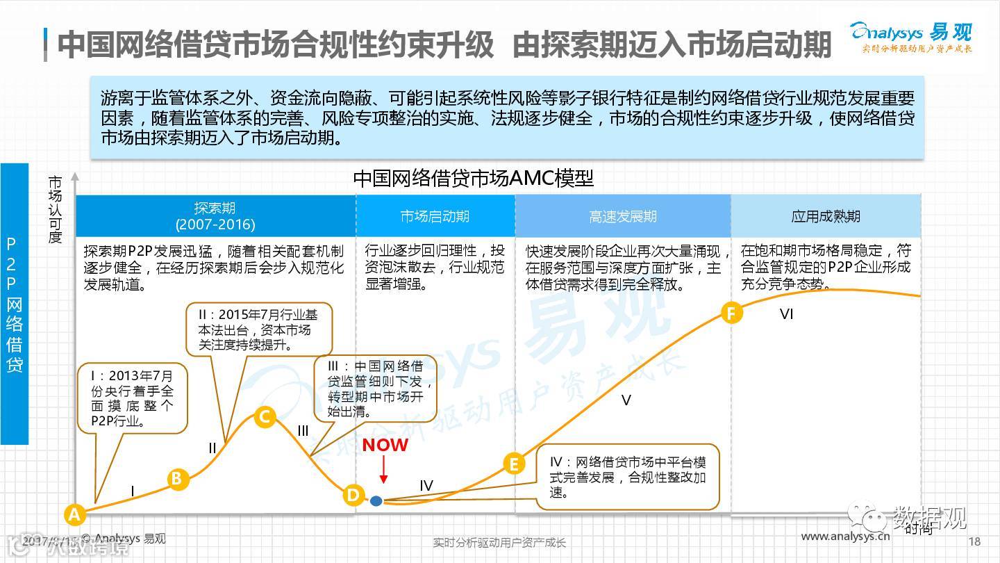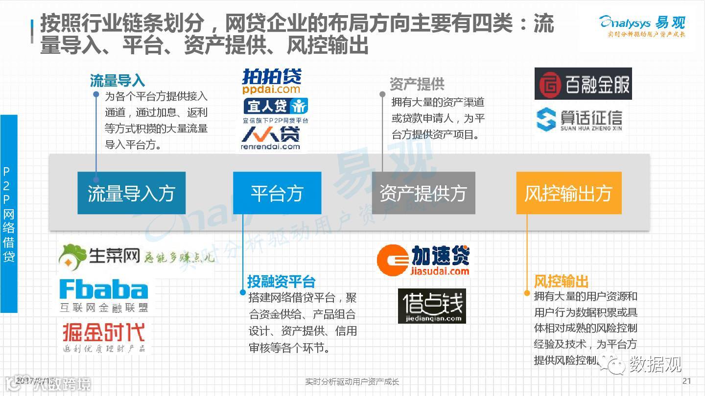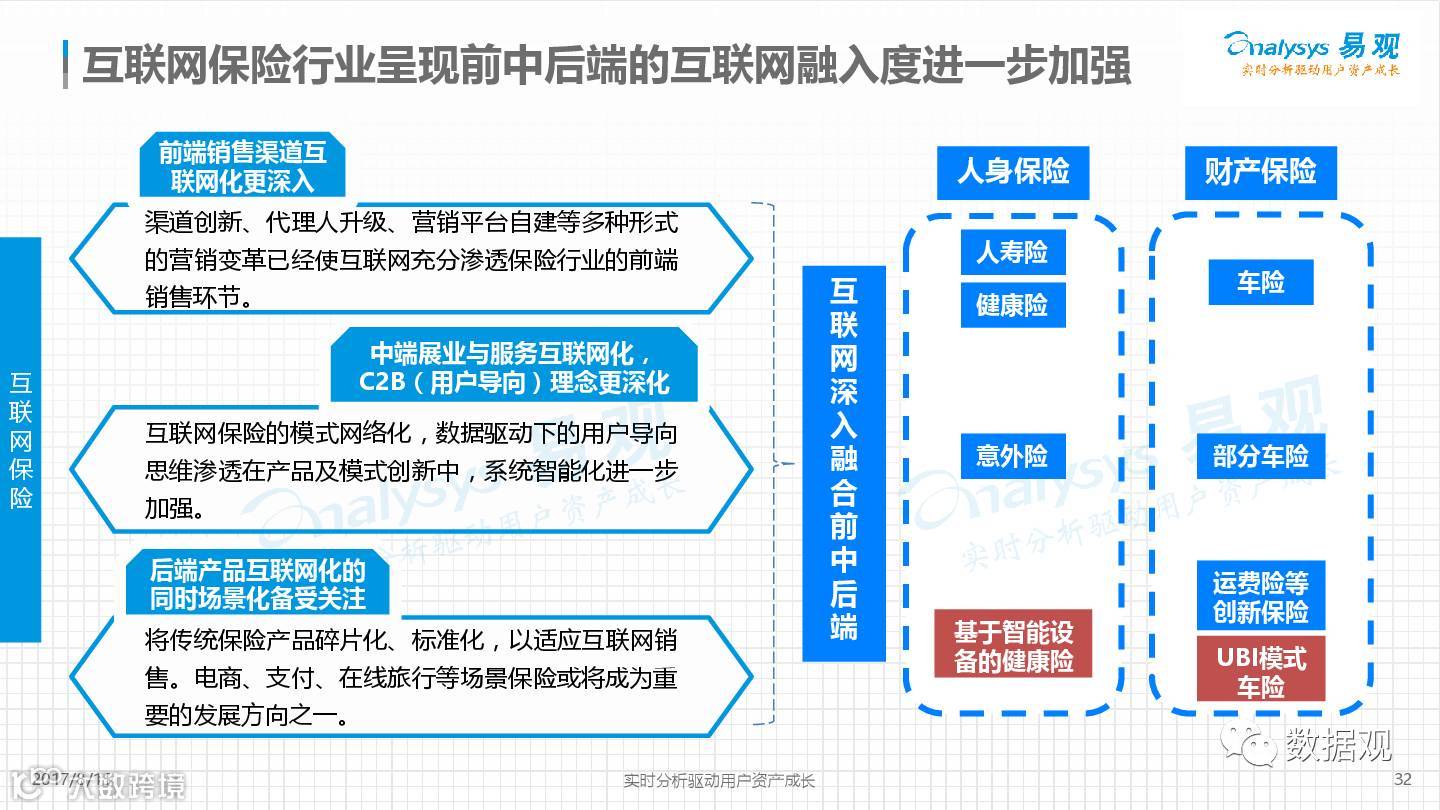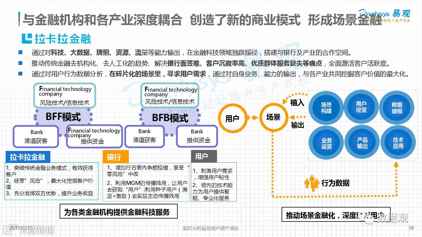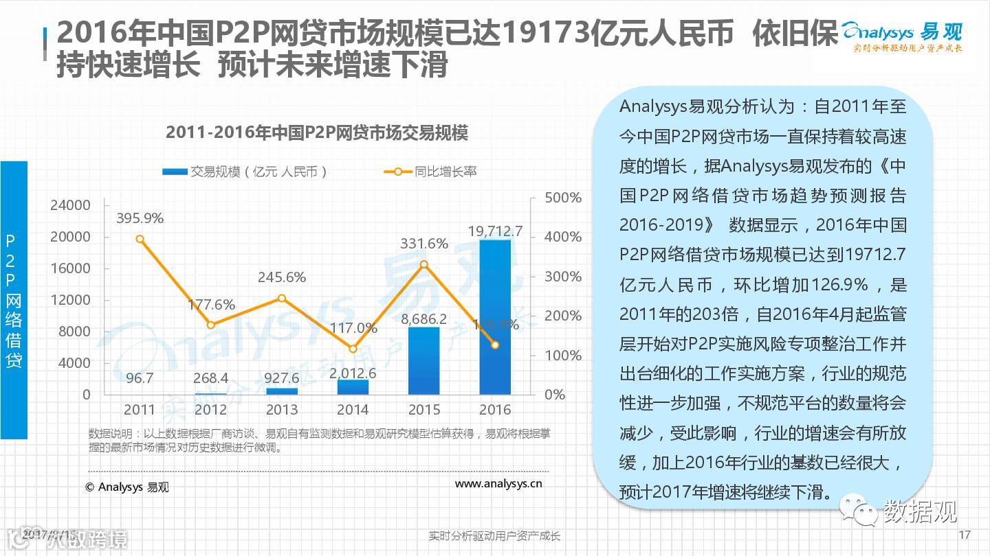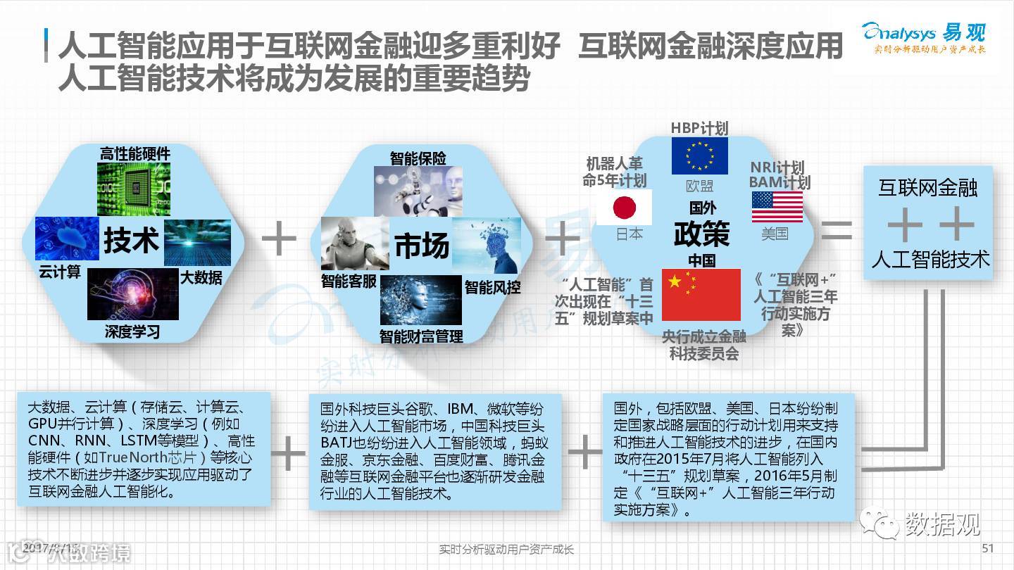 2017年8月,易观发布了《中国互联网金融行业专题分析2017》的专题研究报告。报告的分析内容主要针对《关于促进互联网金融健康发展的指导意见》对于互联网金融各类型的划分,包括第三方支付、网络借贷、互联网理财、互联网保险、股权众筹等。从互联网金融综合概述、细分市场、案例解读、未来趋势四个方面阐述了2016年互联网金融的发展现状及未来互联网金融的发展趋势。