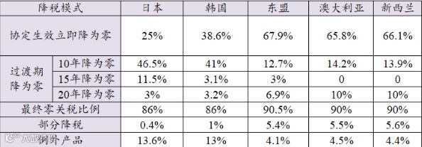 上表可见,中国将对86%的日本和韩国产品关税最终降为零,对东盟、澳大利亚、新西兰产品关税最终降为零的比例达到90%以上,分别为90.5%,90%,90%。