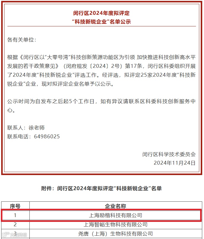 上海励楷科技有限公司荣获闵行区“科技新锐企业”。