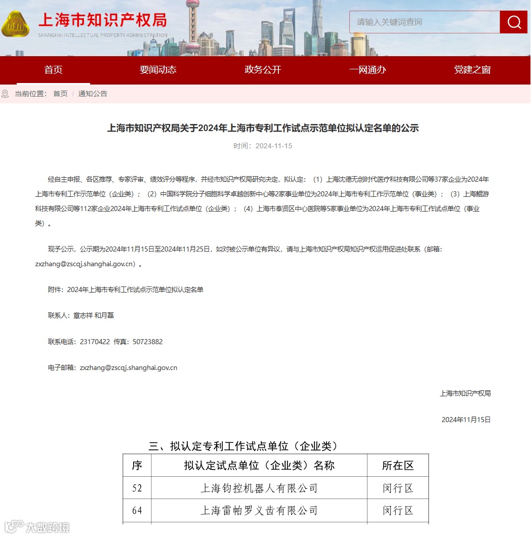 上海钧控机器人有限公司和上海雷帕罗义齿有限公司荣获上海市专利工作试点单位。