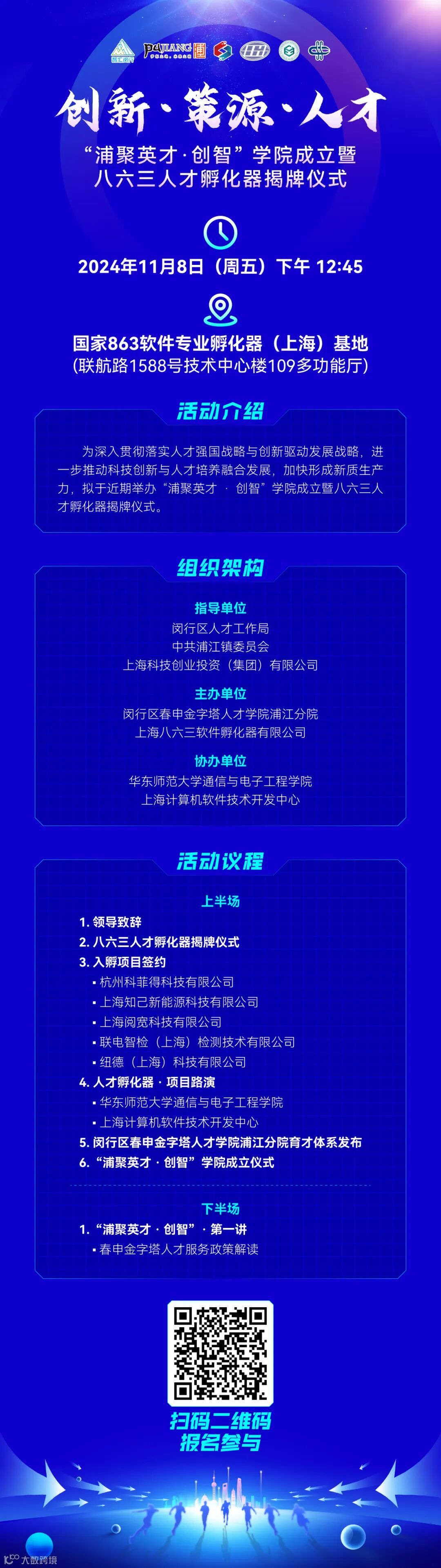 欢迎莅临创新·策源·人才——“浦聚英才·创智”学院成立暨八六三人才孵化器揭牌仪式,期待与各位嘉宾共聚盛会。