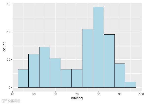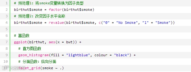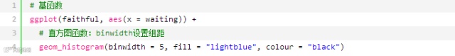 直方图的横轴为绑定变量区间分隔的取值范围,纵轴则表示变量在不同变量区间上的频数。绘制时只需将基函数的美学特征集中配置好需要分析的变量,然后创建新的直方图图层即可。R语言示例代码如下: