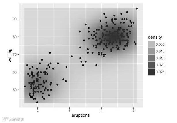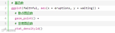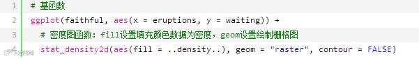 等高线图也是密度图的一种,因此绘制密度图和等高线图用的是同一个函数:stat_density(),只是它们传入的参数不同。首先绘制经典栅格密度图,R语言实现代码如下: