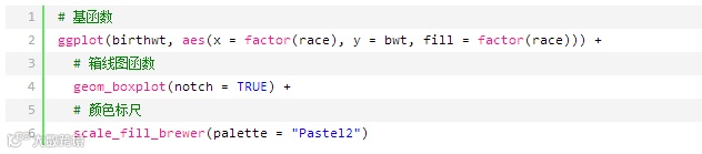 绘制方法是在基函数中将变量分组绑定到横轴,变量本身绑定到纵轴。此外,为了美观也可以将分组绑定到fill变量并设置调色板。R语言示例代码如下: