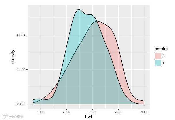 密度曲线表达的意思和直方图很相似,因此密度曲线的绘制方法和直方图也几乎是相同的。区别仅在于密度曲线的横轴要绑定到连续型变量,另外绘制函数的名字不同。R语言示例代码如下: