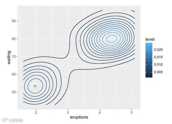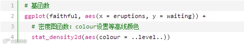 也可以通过设置密度函数美学特征集中的colour参数来给不同密度的等高线着色,R语言实现代码如下: