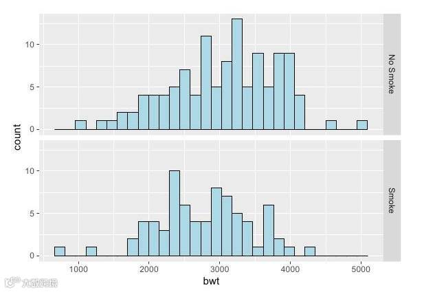 直方图的分组图和本系列前面一些博文中讲的一些分组图不同,它不能进行水平方向的堆积 - 这样看不出频数变化趋势;也不能进行垂直方向的堆积 - 这样同样看不出趋势。这里采用一种新的堆积方法:重叠堆积,R语言实现代码如下: