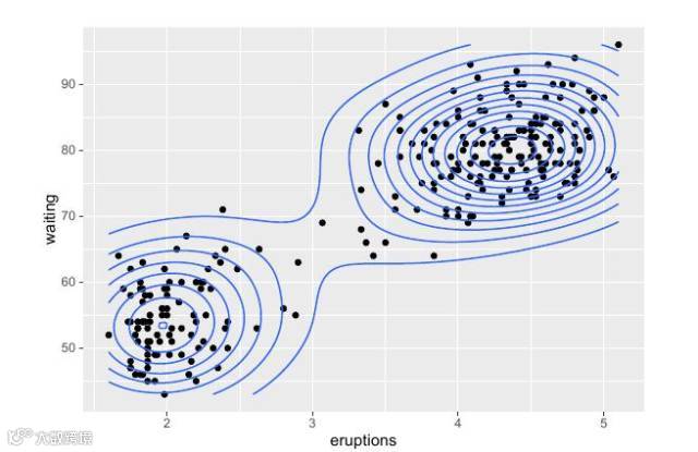 绘制2D等高线主要是调用stat_density()函数。这个函数会给出一个基于数据的二维核密度估计,然后我们可基于这个估计值来判断各样本点的"等高"性。接下来首先给出各数据点及等高线的绘制方法,R语言实现代码如下: