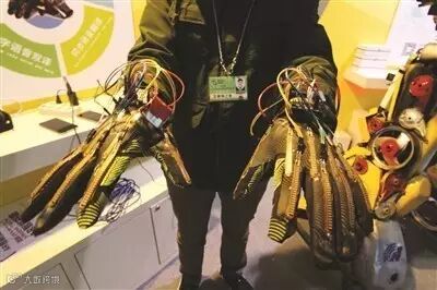 由盈米科技开发的特殊手套,聋哑人只要带上,接上手机,打手语的时候手机就能发出语音。据说目前已经能转换300个词汇,准确率达90%。