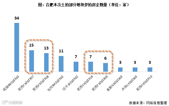 因此,本轮土拍也延续了上一轮的超高关注度:据不完全统计,参拍房企总数超过60家,其中滨湖区省府东板块BK202303地块参拍房企数量超过30家,包河BH202302号地块、肥西县07、08号地块的参拍房企数量也均超过10家,甚至多于一些市区地块。