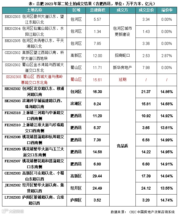 最终,16宗地块(含肥西县)中有10宗进入竞品质环节,总成交价约为142.5亿元,整体溢价率达到12.39%,仅包河区3宗城市更新用地、高新区租赁用房地块和蜀山区SS202302号地块成交,蜀山区另一宗地块延期出让。土地市场“冰火两重天”之下,普通商品房地块基本都进入竞品质环节,土地市场明显延续了高热度运行。