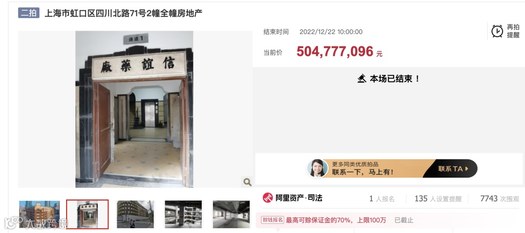 这是德邻公寓第二次被司法拍卖,共有7000余人次围观。11月初,德邻公寓被江苏徐州中级法院挂上司法拍卖平台,吸引了1.8万余次围观,以5.6亿元的起拍价进行首次拍卖,但因无人报名参拍而流拍。此次则降价5600万再次竞拍,终得买家。