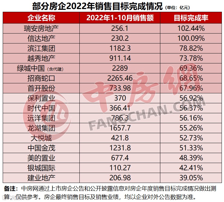 具体来看,截至10月末,瑞安房地产和信达地产两家房地产企业已经提前完成了全年销售任务,目标完成率分别为102.44%和100.09%。