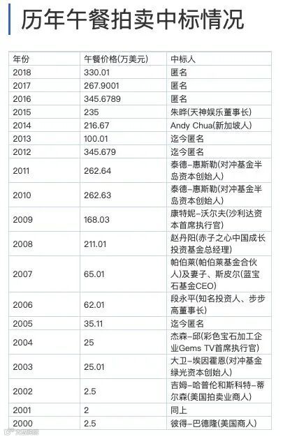 此前的中标者包括对冲基金经理David Einhorn,他在2003年花了25.01万美元与巴菲特共进晚餐,在拍卖结束后又捐赠了25万美元。Guy Spier在2007年与另外两人一起支付了650100美元,获得与巴菲特共进午餐的机会。