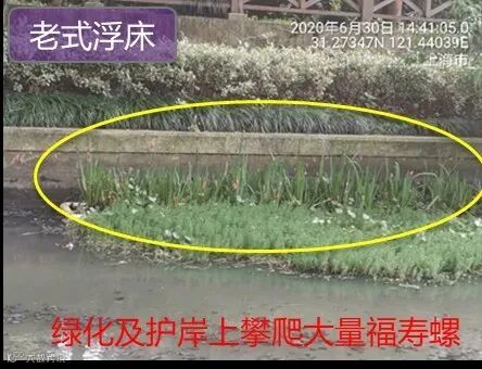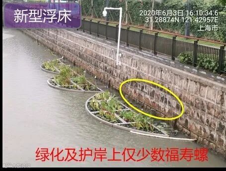 河道浮床漂浮于水面,并且种植了大量挺水植物,往往成为福寿螺聚集产卵的重灾区,清理起来也比较麻烦。但是在我们实际项目中也发现,在某些类型的浮床上面,福寿螺卵的数量却明显比较少,例如图6右侧图片中新型生态浮床是上海汀滢环保公司的新型生态浮床产品,采用多孔弹性环保材料作为浮块基质,具有抗风浪、抗腐蚀、寿命长、维护成本低的优点,浮床和周边驳岸上的福寿螺卵数量明显少于传统浮床。