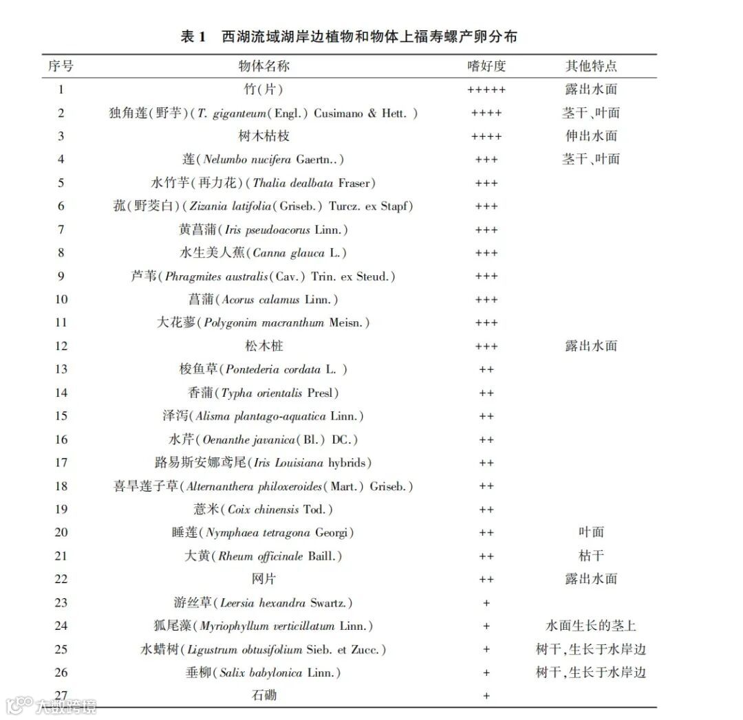 福寿螺雌螺喜欢夜间爬到离水面15~40cm的池壁、木桩或水生植物的茎叶上产卵,利用福寿螺这一特点,人为布置插杆为其创造适宜的产卵场所,然后进行人工移除,再集中进行销毁。根据楼晓明等(2021年)在西湖流域所做的相关研究,福寿螺产卵偏好和分布详见表1。