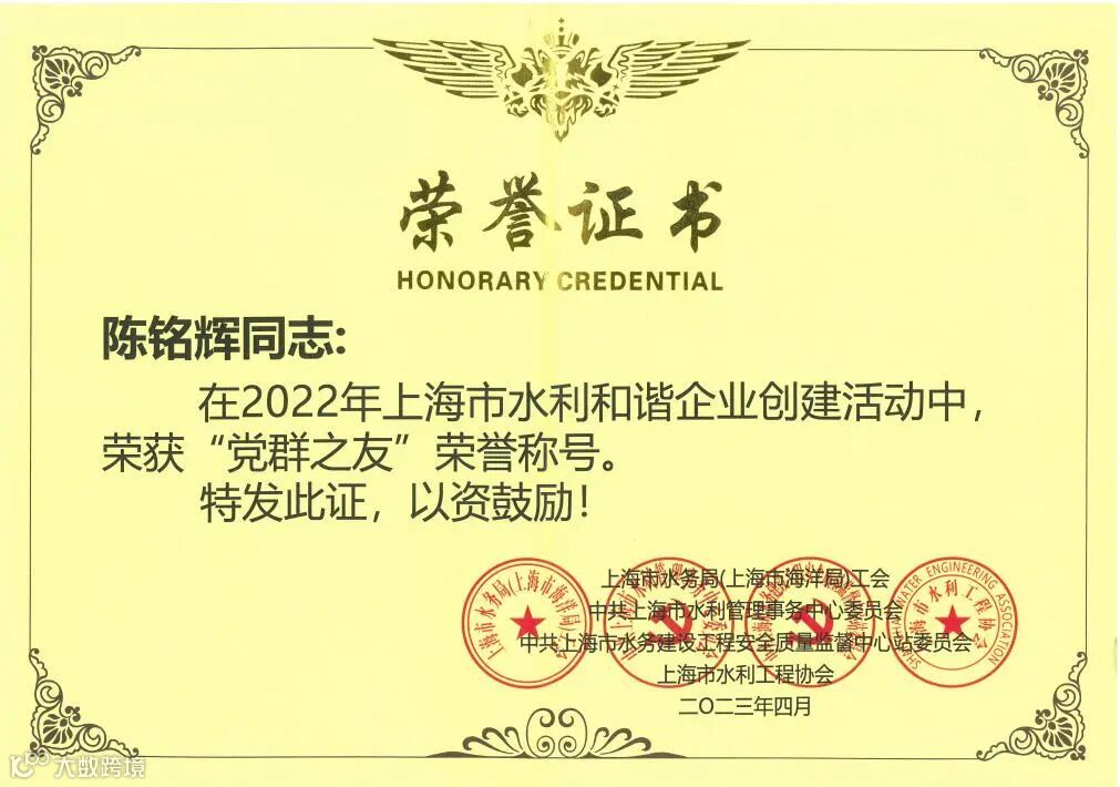 近日,上海宏波集团接连收获喜讯,在上海市水务局(上海市海洋局)工会、中共上海市水利管理事务中心委员会、中共上海市水务建设工程安全质量监督中心站委员会、上海市水利工程协会联合开展的2022年上海市水利和谐企业创建活动中,宏波公司荣获“和谐之星”荣誉称号、宏波公司工会荣获“先进职工之家”荣誉称号、集团副总裁陈铭辉荣获“党群之友”荣誉称号。