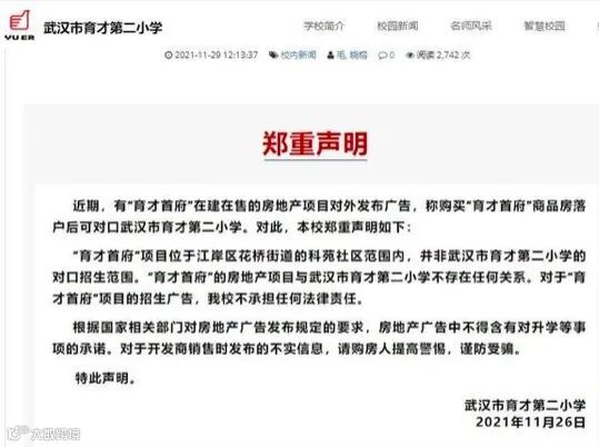 该广告指向的武汉市育才第二小学公开发布辟谣声明,直指该房地产项目与学校不存在任何关系,“对于开发商销售时发布的不实消息,请购房人提高警惕,谨防受骗”。