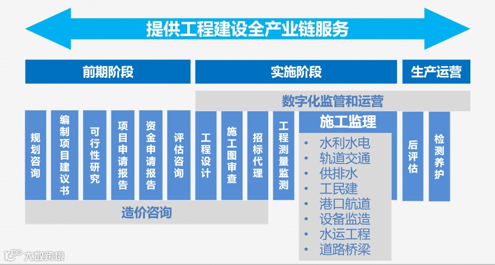集团行政管理设两中心、两板块,组织架构、管理制度及质量管理体系健全,旗下公司拥有多项国家高等级资质,可提供包括前期咨询、专项设计、项目管理、造价咨询、工程勘察及测绘、施工监理、工程总承包、运营养护等在内的全过程咨询及全产业链服务,业务涵盖水利水务、工业及民用建筑、交通水运、轨道交通、园林绿化、机电设备、生态环保、信息化等领域,市场遍及全国二十多个省市。