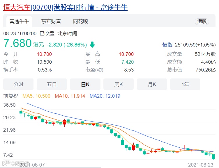 截止8月23日收盘,恒大遭遇史无前例的重挫。中国恒大报4.31港元/股,跌幅达到了12.4%,较历史高位跌去了80%左右;恒大物业报5.47港元/股,跌幅9.14%;而恒大汽车报7.68港元,跌幅26.86%,较历史高点跌去了90%左右。