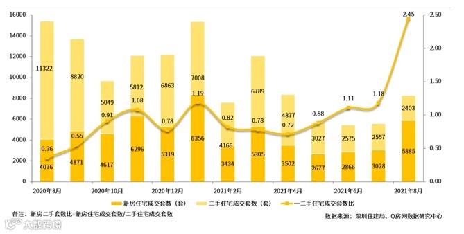 4月以来,深圳一二手住宅成交套数比持续攀升,8月该比例更是“窜到”2.45。