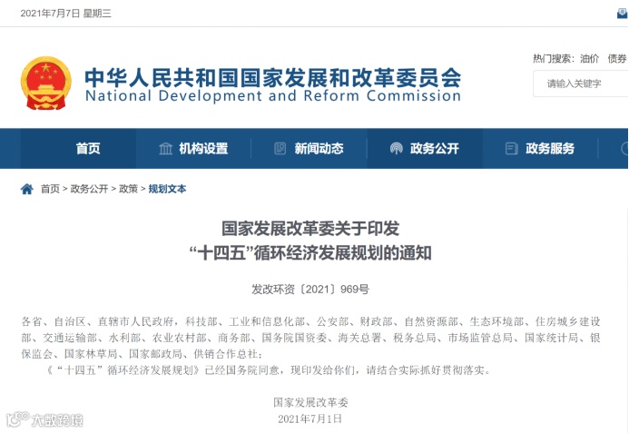 7月7日,国家发展改革委发布《“十四五”循环经济发展规划》(下称《规划》),提出了三个重点任务,十一项重点工程与行动与四方面政策保障。