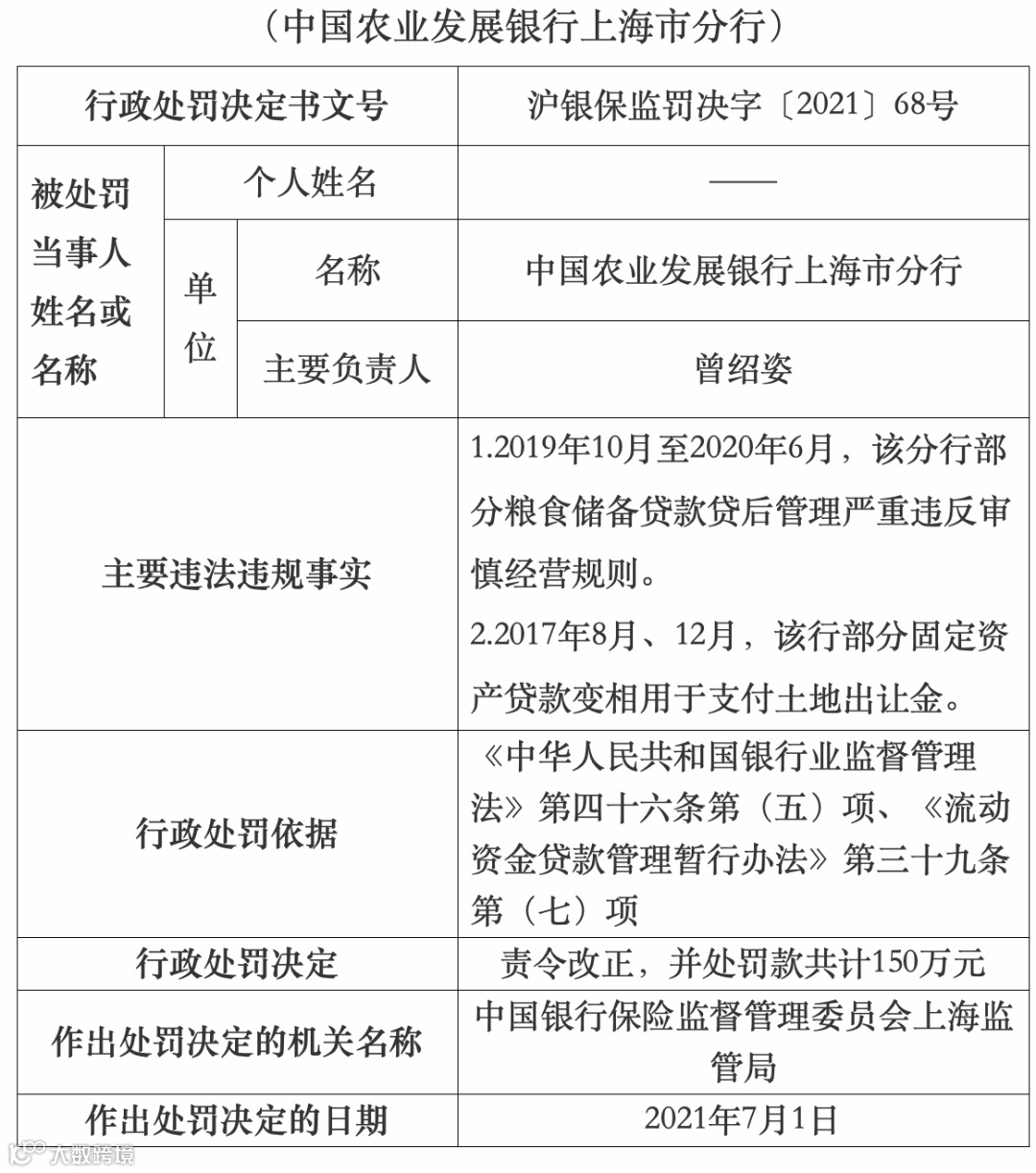 具体来看,农发行上海分行被罚150万元,被罚事由包括2017年8月、12月,部分固定资产贷款变相用于支付土地出让金,据悉,这主要涉及农发行上海市闵行区支行和农发行上海市南汇支行两家支行,同时两家支行相关人士也被予以警告;另外,2019年10月至2020年6月,该分行部分粮食储备贷款贷后管理严重违反审慎经营规则。