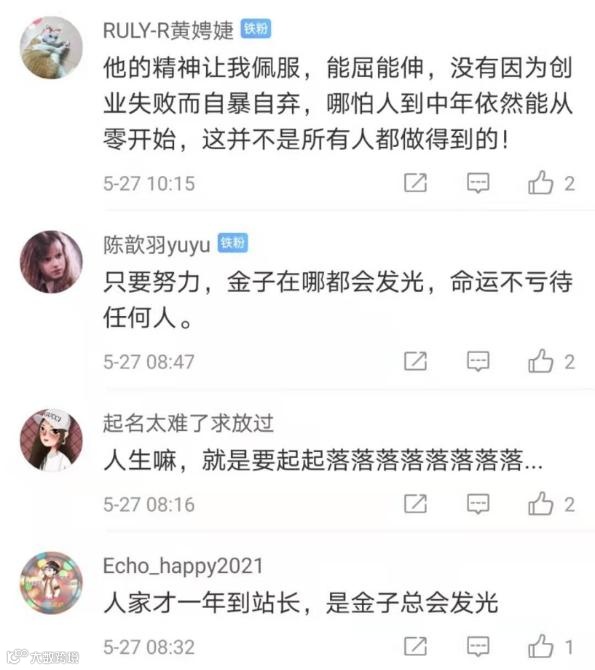 还有网友为其加油点赞。“能屈能伸 有重新开始的勇气”“他的精神让我佩服,能屈能伸,没有因为创业失败而自暴自弃,哪怕人到中年依然能从零开始,这并不是所有人都做得到的!”