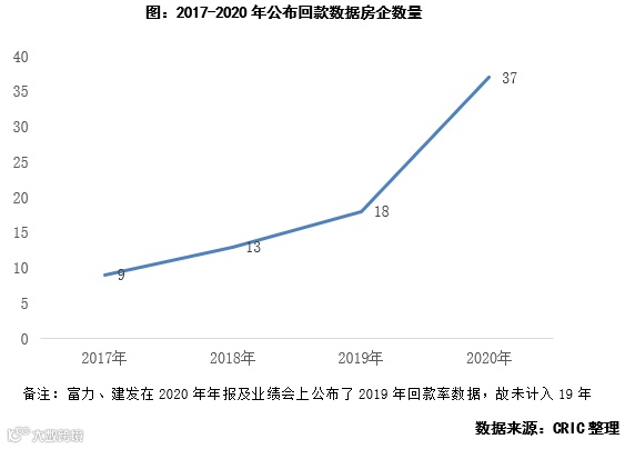 之后两年,公布回款数据的房企数量开始出现持续增长,2020年年报及业绩发布会上公布销售回款率的房企数量已经达到了37家,超出2019年一倍还多。