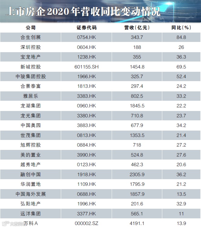 相比之下,2020年也有29家上市房企营收出现下滑,其中恒盛地产、禹洲集团、上置集团、瑞安房地产、北大资源等营收跌幅均超过50%。