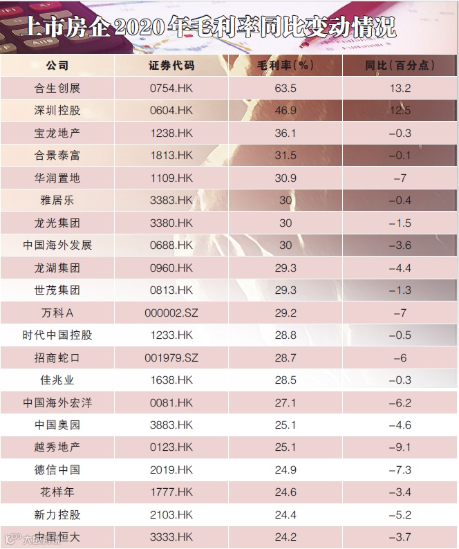 在列入统计的41家已经公布年报的上市房企中,毛利率达到或超过30%的仅有8家,同比减少11家。毛利率同比上升的只有合生创展、深圳控股和金辉控股3家,其余38家均出现毛利率下滑。